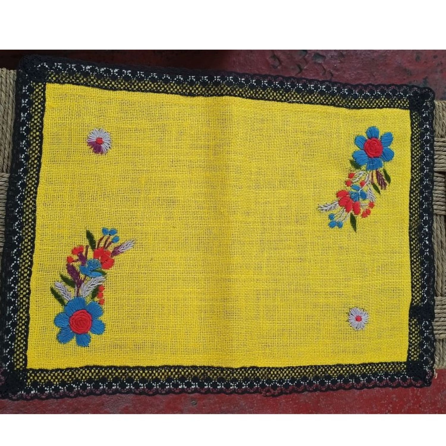 Hand embroidered table mat yellow jute