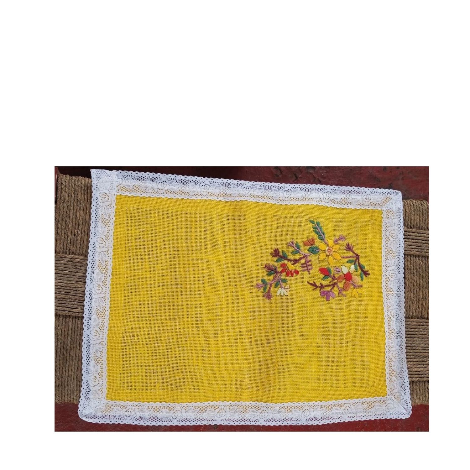 hand embroidery with crochet lace on yellow jute material