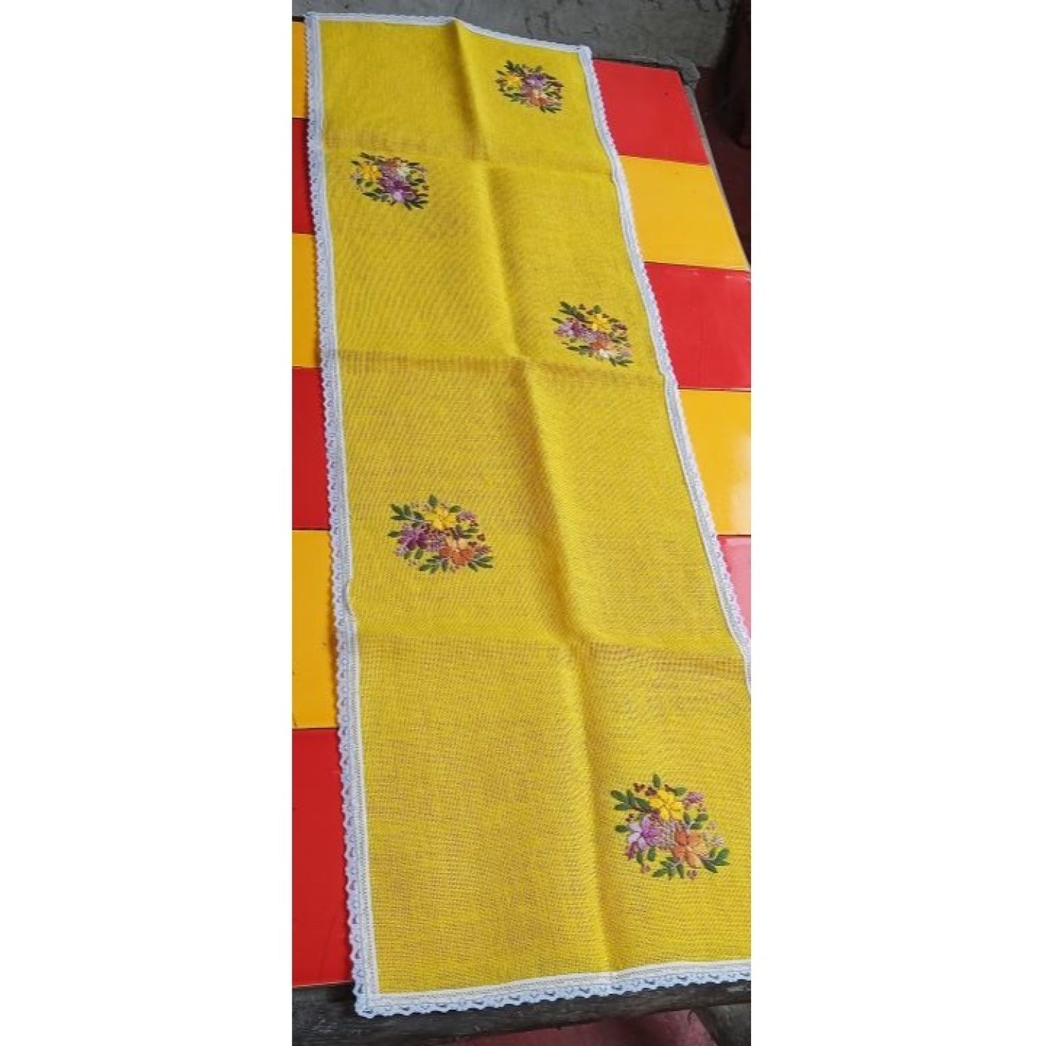 Jute table runner yellow with hand embroidery