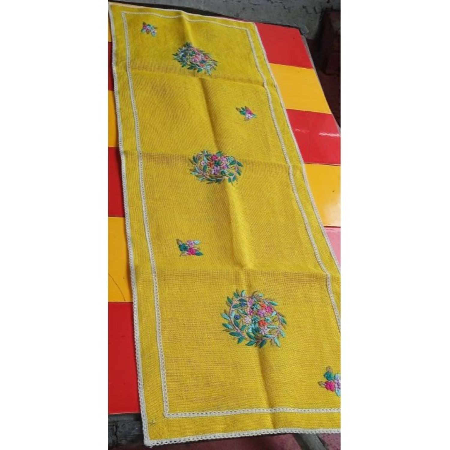 Yellow table runner with hand embroidery